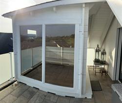 Neuwertige Aussensauna zu verkaufen • Außensauna aus langlebigen Blockbohlen • Weisse Außenverkleidung • Innenraum aus Holz • Große Fenster und Glastür • Platz für bis zu vier Personen • Inklusive Ofe...